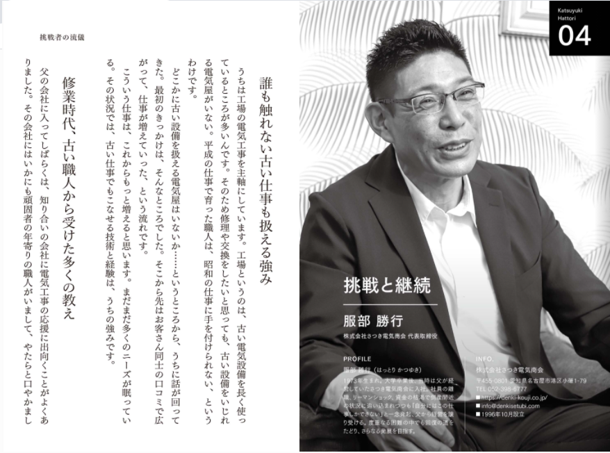 « 挑戦と継続 株式会社さつき電気商会 服部勝行 書籍[2020年注目の社長30人]挑戦者の流儀(Parade Books)に、弊社代表 服部勝行が紹介されました。 »